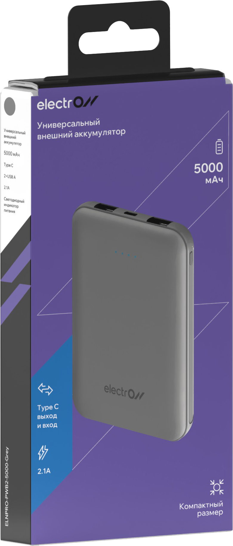 Портативное зарядное устройство Electron 5000 мАч, 2*USBA + TypeC, 10Вт серый (ELNPRO-PWB2-5000)