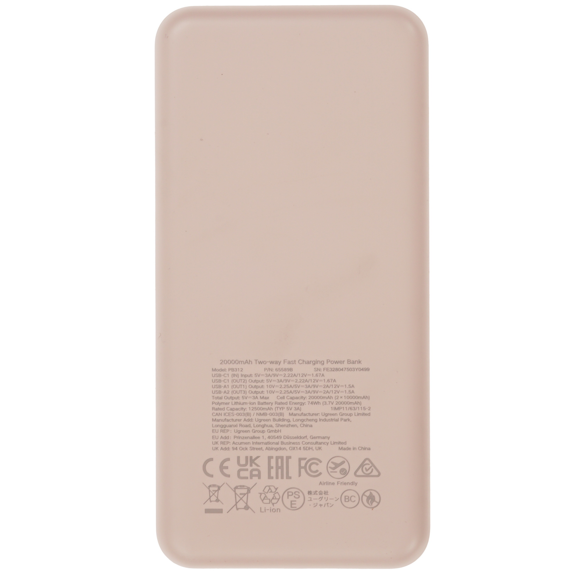 Портативный аккумулятор Ugreen PB312 розовый (65589B)