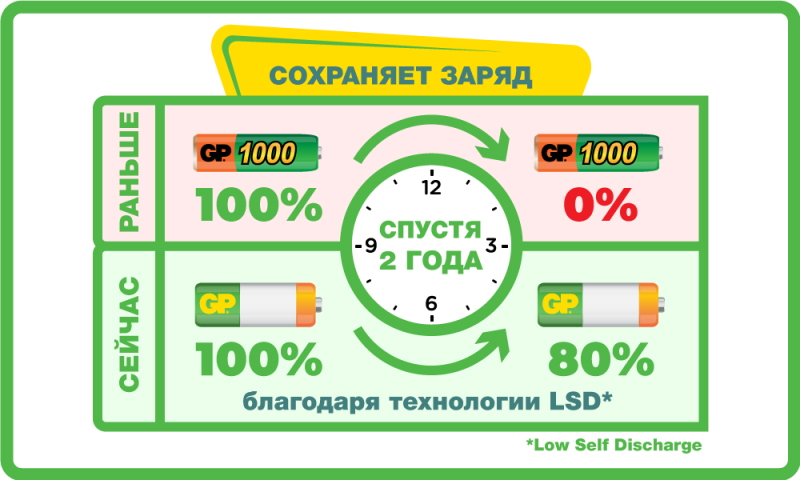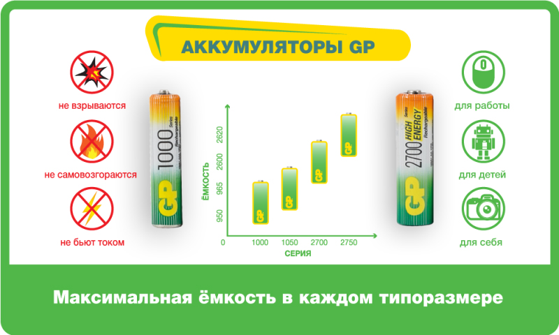 Перезаряжаемые аккумуляторы GP используются повсюду и применимы в широком спектре устройств. Все типы таких аккумуляторов сохраняют энергию длительное время и могут быть перезаряжены до 500 раз. Большой ассортимент позволяет найти подходящее решение для любой ситуации.