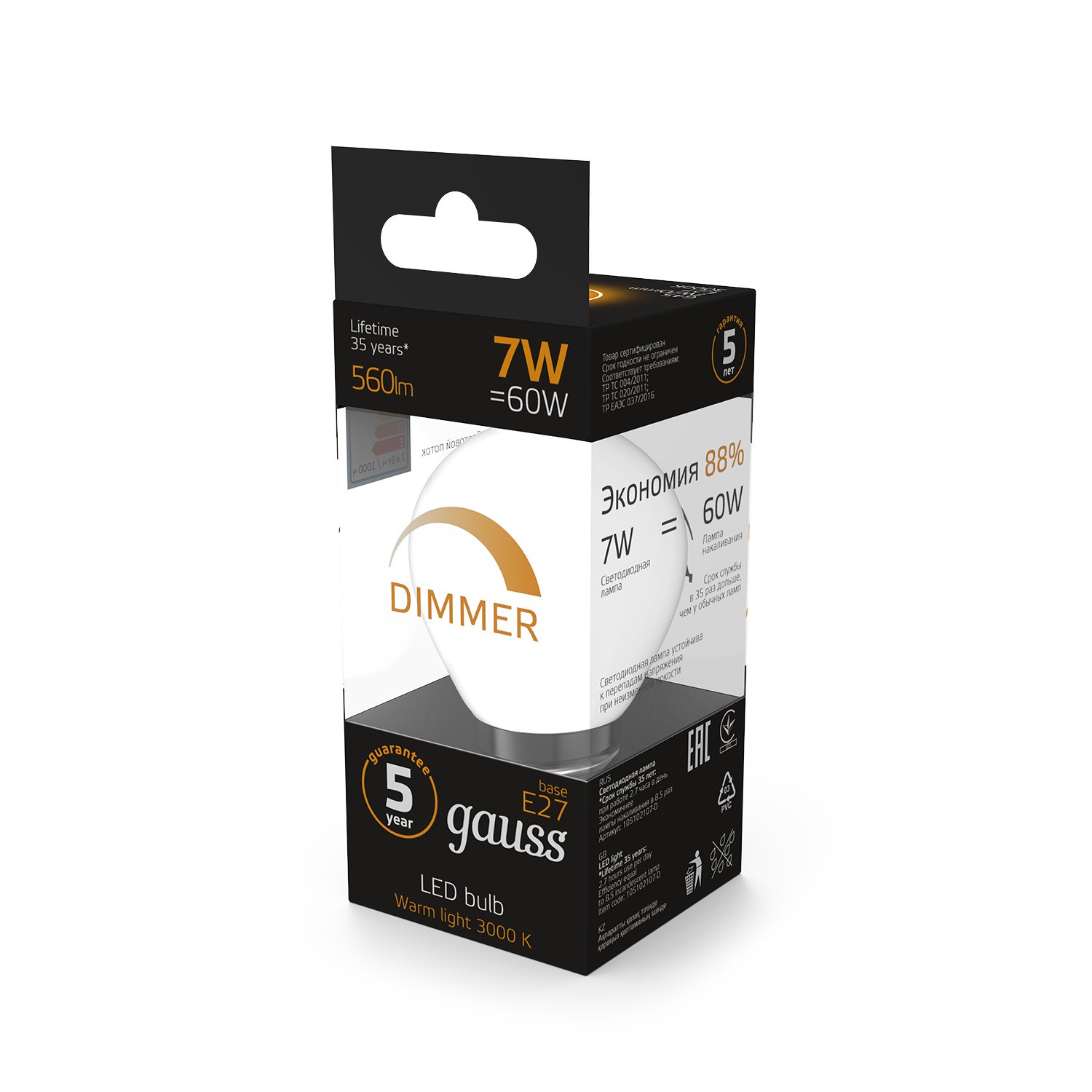 Светодиодная лампа Gauss Шар 7W 560lm 3000К Е27 (10шт.)
