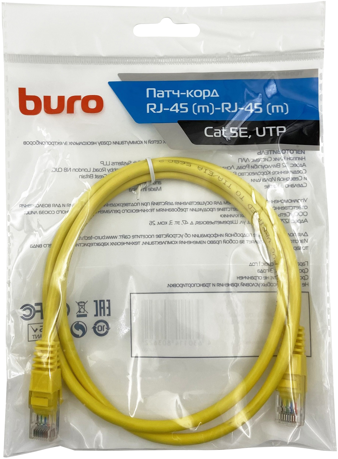 Патч-корд Buro UTP 4 пары cat.5E CCA molded RJ-45 (m)-RJ-45 (m) 1 м желтый (UTP-5E-1M-Y)