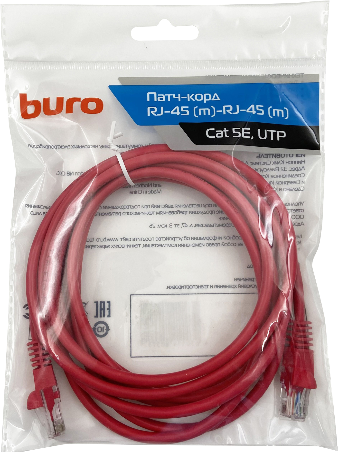 Патч-корд Buro UTP 4 пары cat.5E CCA molded RJ-45 (m)-RJ-45 (m) 3 м красный (UTP-5E-3M-R)