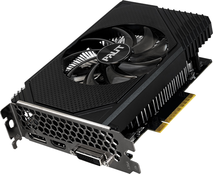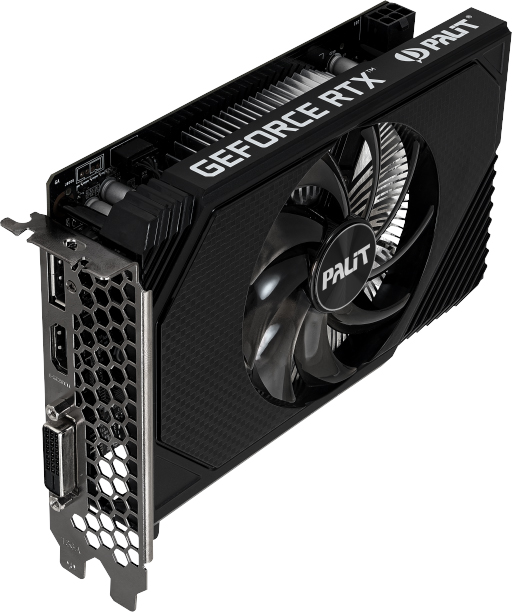 Главное преимущество этой модели — ее компактные размеры. Длина всего 162 мм делает ее идеальным выбором для установки в небольшие корпуса формата mini-ITX. За охлаждение отвечает активная система StormX с одним вентилятором и тепловыми трубками, которая эффективно отводит тепло и занимает два слота расширения. Для работы требуется подключение одного 8-контактного разъема питания. Для подключения дисплеев предусмотрен универсальный набор портов, включающий HDMI версии 2.1, DisplayPort и DVI.