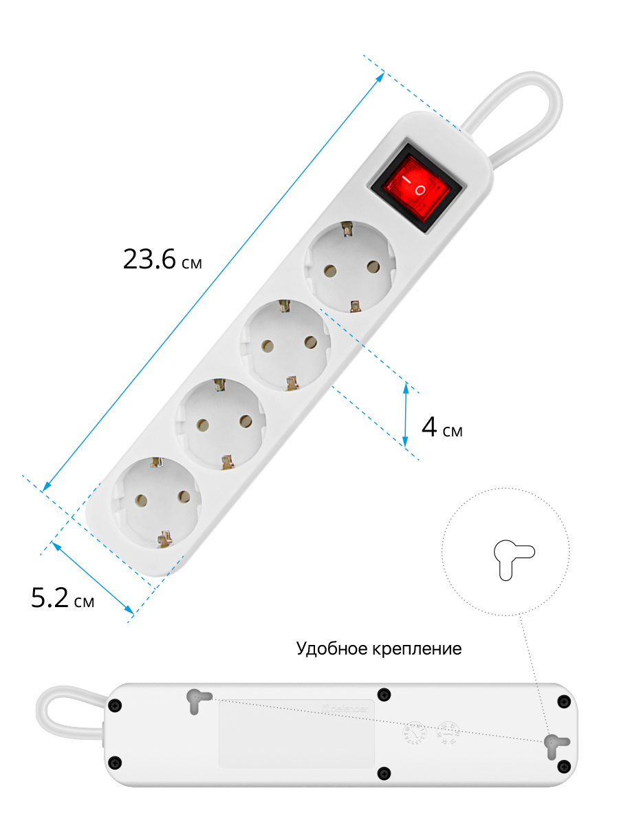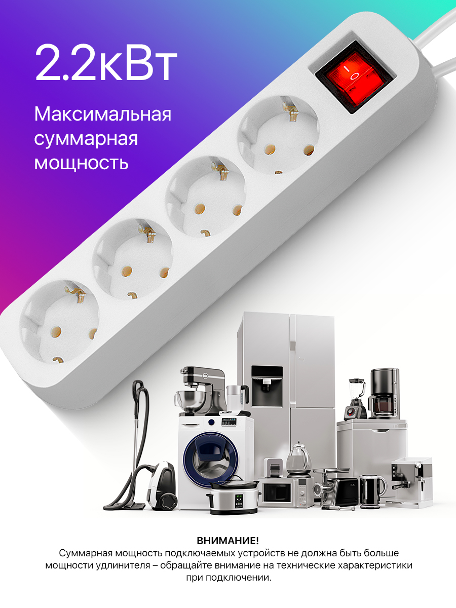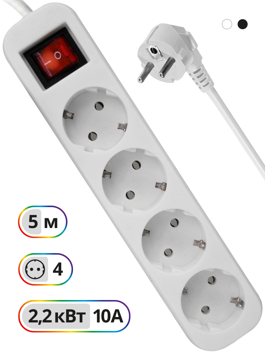 ✔ Предусмотрена возможность крепления на стену.✔ Длина провода 5 метров.✔ Мощность 2200 Вт. Максимальный допустимый ток 10А.✔ Корпус из негорючего пластика.✔ Индикатор сети.✔ Выключатель питания.