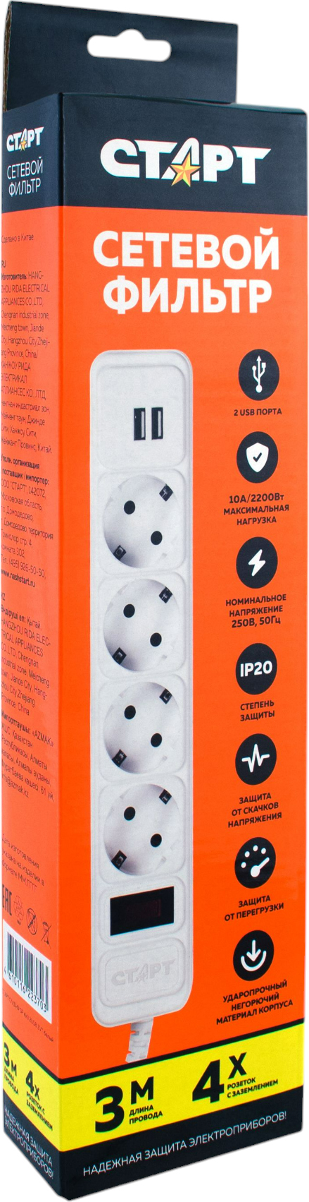 Удлинитель Старт SP 4x3 ZVT 2 USB белый