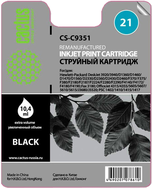 Картридж Cactus CS-C9351 №21 для HP DeskJet 3920/3940/D1360/D1460/D1470 черный