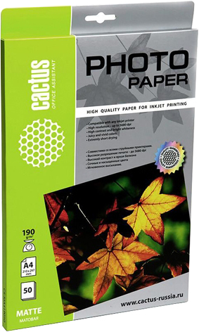 Фотобумага Cactus CS-MA4190 A4/190г/м2 подходит для печати фотографий с применением цветных струйных принтеров, поддерживающих формат носителей А4.