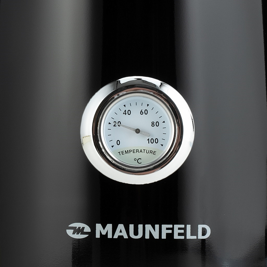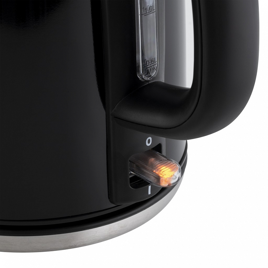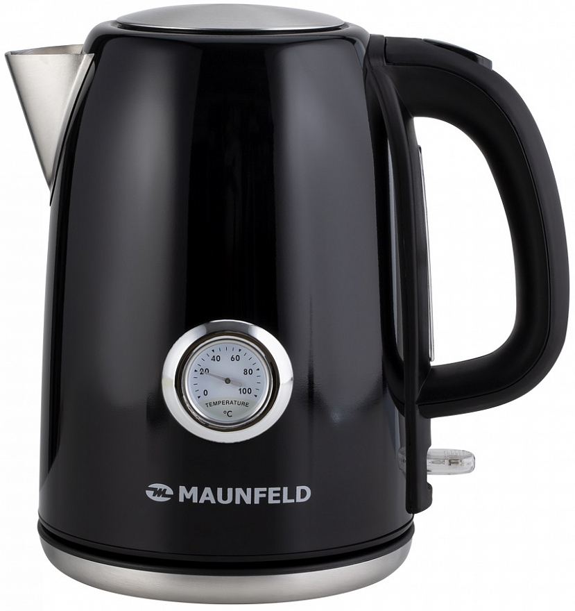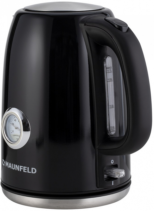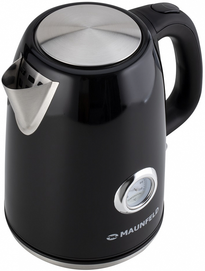 Ручка выполнена из теплоизолирующей пластмассы черного цвета и не нагревается от стального корпуса. На ней находится кнопка включения/выключения. Термометр с индикатором уровня воды находится непосредственно на корпусе чайника. В носике крепится съемный фильтр, который легко достается и моется.