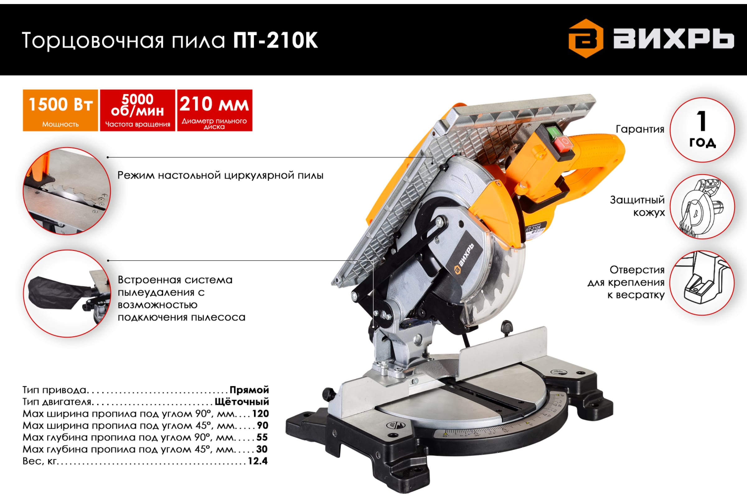 Торцовочная пила Вихрь ПТ-210К 72/18/6 с электрическим сетевым приводом используется для поперечного распила длинных заготовок, как под прямым углом, так и под произвольно выбранным углом.