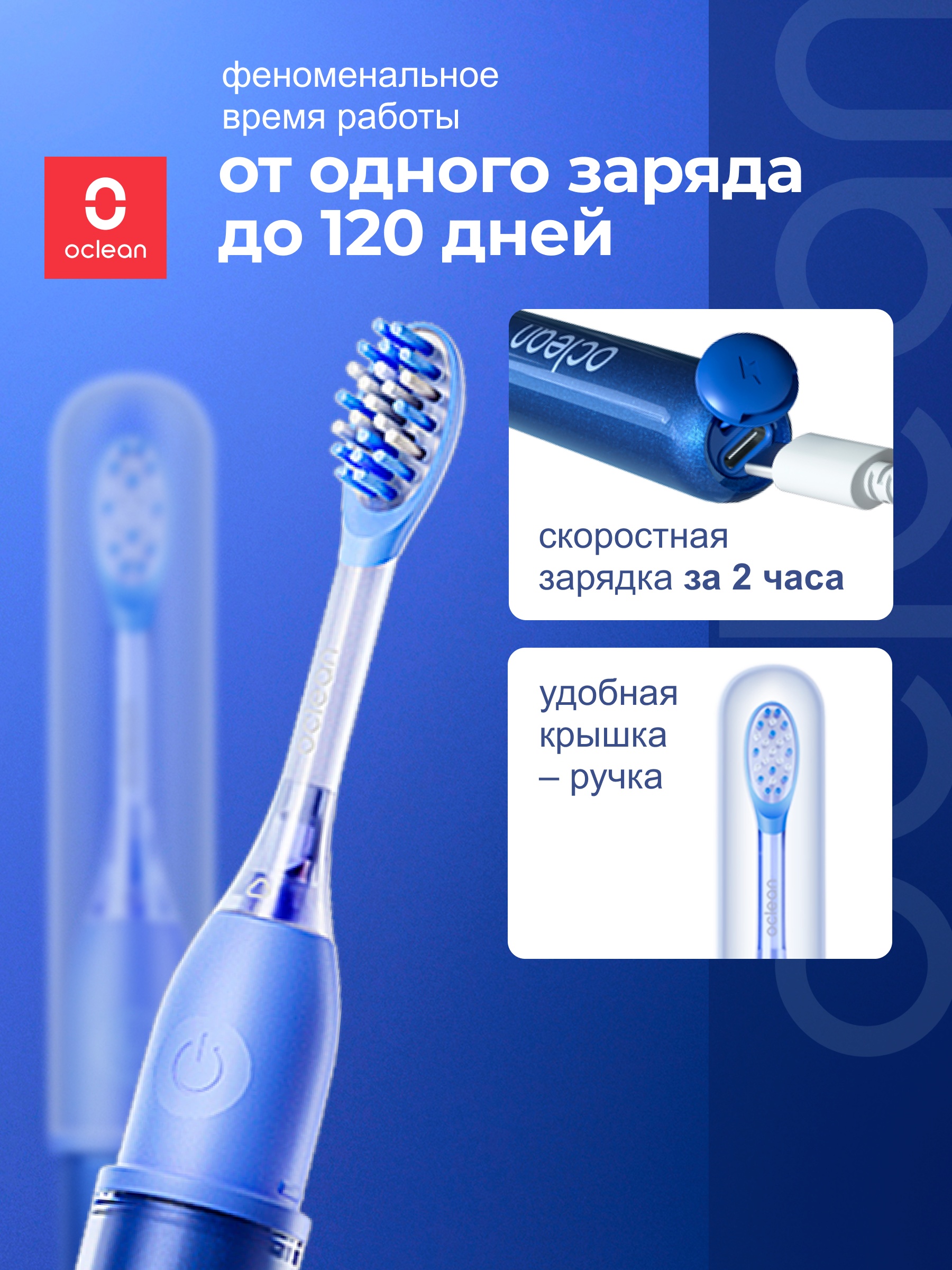 Благодаря встроенному литий-ионному аккумулятору, Oclean Ease демонстрирует впечатляющую автономность — до 120 дней без подзарядки при стандартном режиме использования. При необходимости аккумулятор полностью заряжается всего за 2 часа через универсальный разъём USB Type-C.