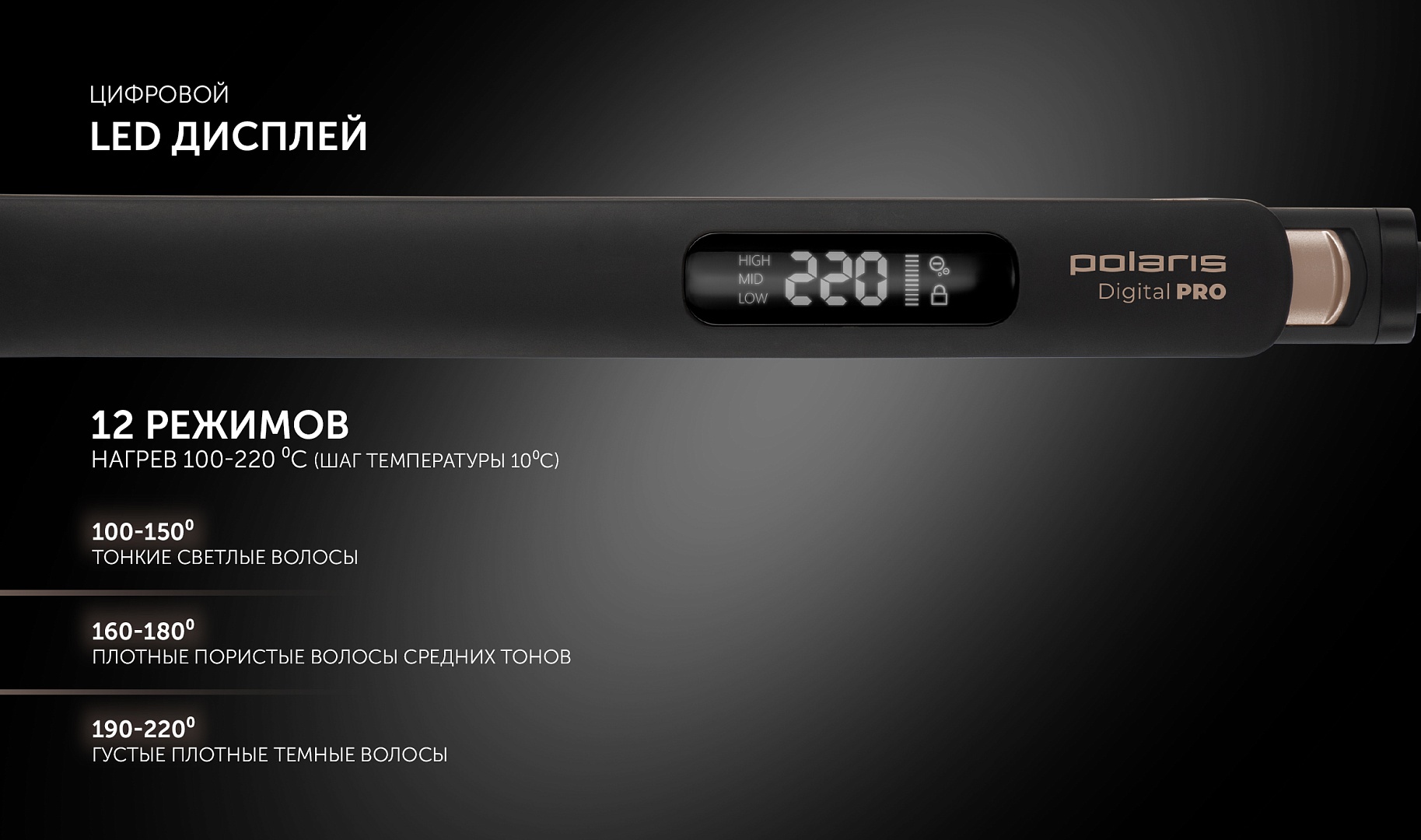 Цифровой LED дисплей 12 режимов нагрева: 100-220 ⁰С с шагом температуры 10⁰С