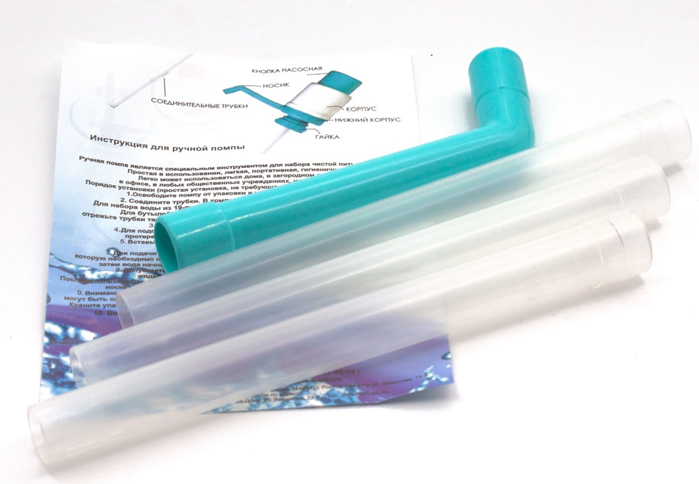 Закрепляется на горлышке бутыли при помощи надежного цангового зажима, длинная составная трубка позволяет откачивать питьевую воду даже со дна бутыли.