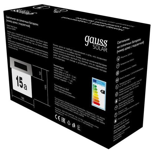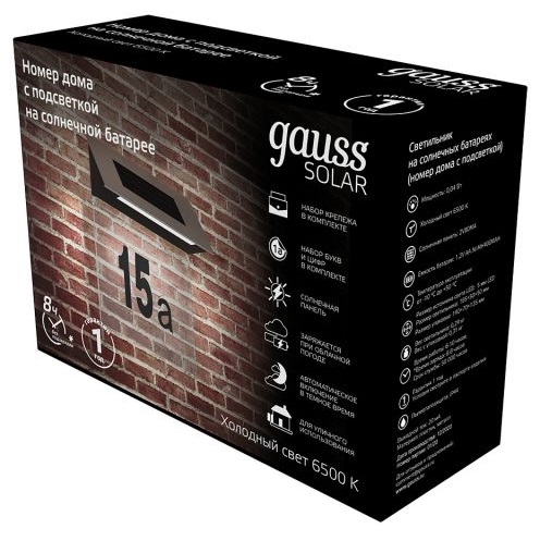 Светильник на солнечных батареях Gauss серии Solar предназначен для подсветки указания номера дома. Номер дома с подсветкой Gauss работает от солнечной батареи, использующей энергию солнца для зарядки встроенного аккумулятора, поэтому является экологически чистым и экономит электроэнергию. Номер дома с подсветкой не требует подключения к сети, что позволяет устанавливать его в любых, даже труднодоступных местах. Номер дома с подсветкой на солнечной батарее можно использовать круглый год, потому что он заряжается даже при облачной погоде и устойчив к изменению погоды и температуры.