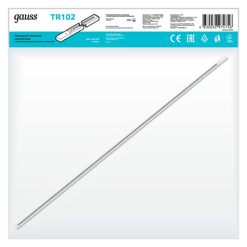 Шинопровод Gauss TR102 с адаптером питания и заглушкой (белый)