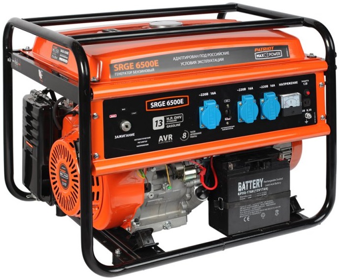 Генератор PATRIOT Max Power SRGE 6500E – мощная модель, подходящая для электроснабжения частного дома, коттеджа, магазина, склада или даже заправочной станции. Он построен на основе верхнеклапанного двигателя, сочетающего высокую производительность с малым расходом топлива и низкой токсичностью выхлопа. При установке батареи его можно запускать с помощью встроенного электрического стартера. Многоступенчатая система безопасности автоматически отключает устройство в случае перегрева, перегрузки, замыкания или критического снижения уровня масла. Прочная металлическая рама и усиленная передняя панель надежно защищают внутренние компоненты от механических повреждений. Генератор оснащен тремя розетками на 220 В и одним 12-вольтовым выходом для подзарядки автомобильных аккумуляторов.