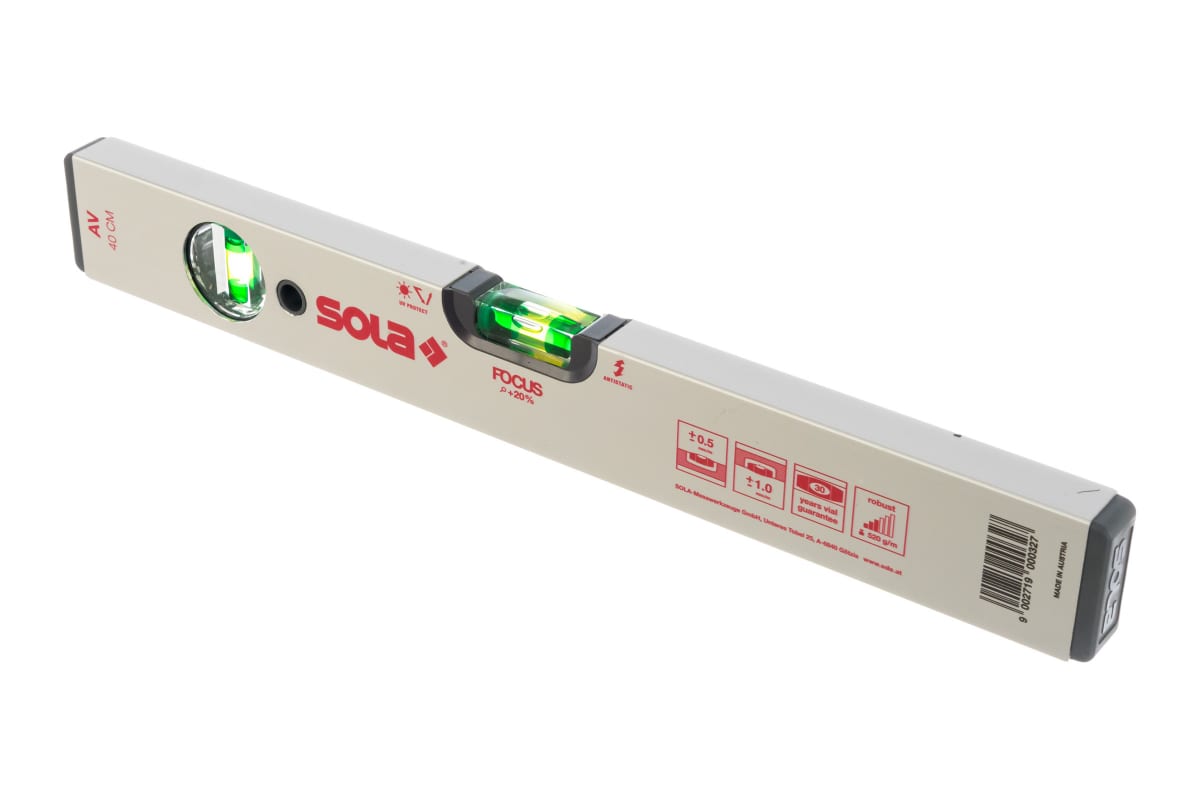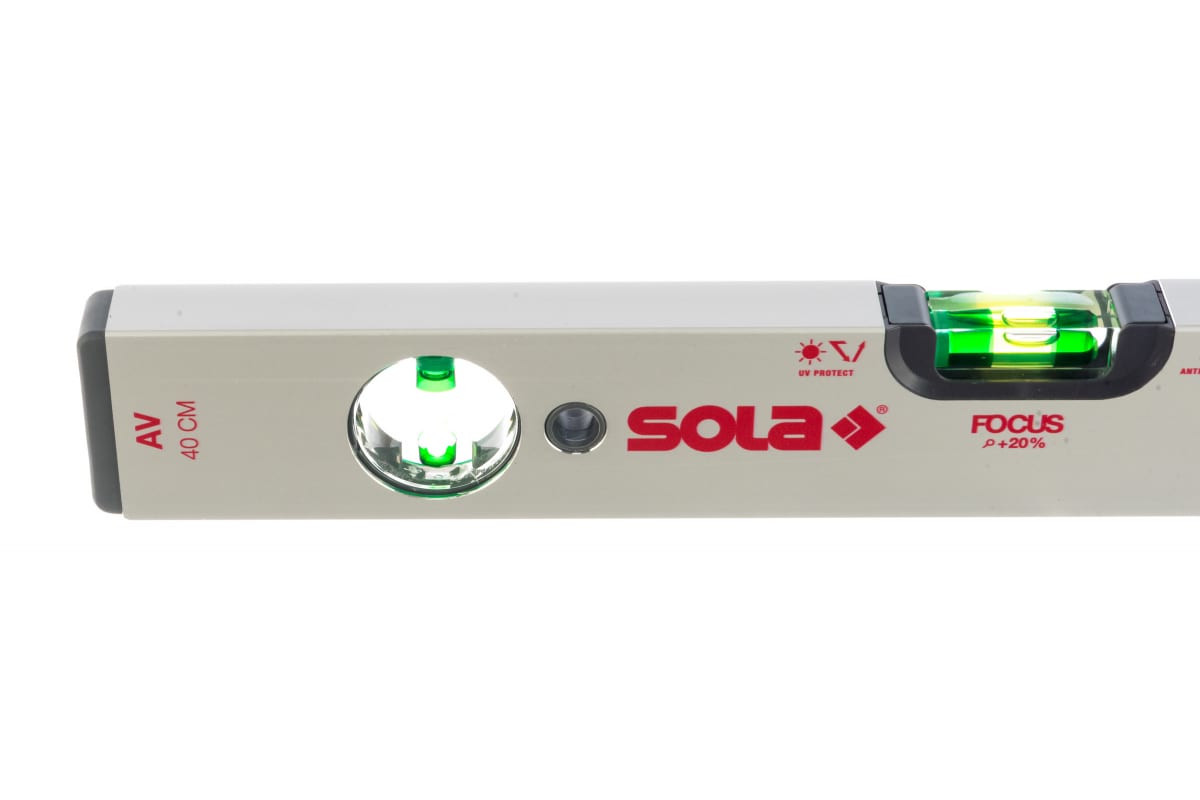 • Описание: Уровень, L - 40 см, 2 глазка SOLA AV 40 01110501 оснащается ударопрочными глазками. Корпус выполнен из алюминиевого сплава, который отличается высокой прочностью. Читаемость в затемненном помещении обеспечивается благодаря светоотражающей подложке. На концах прибора имеются колпачки поглощающие удары при случайном падении.