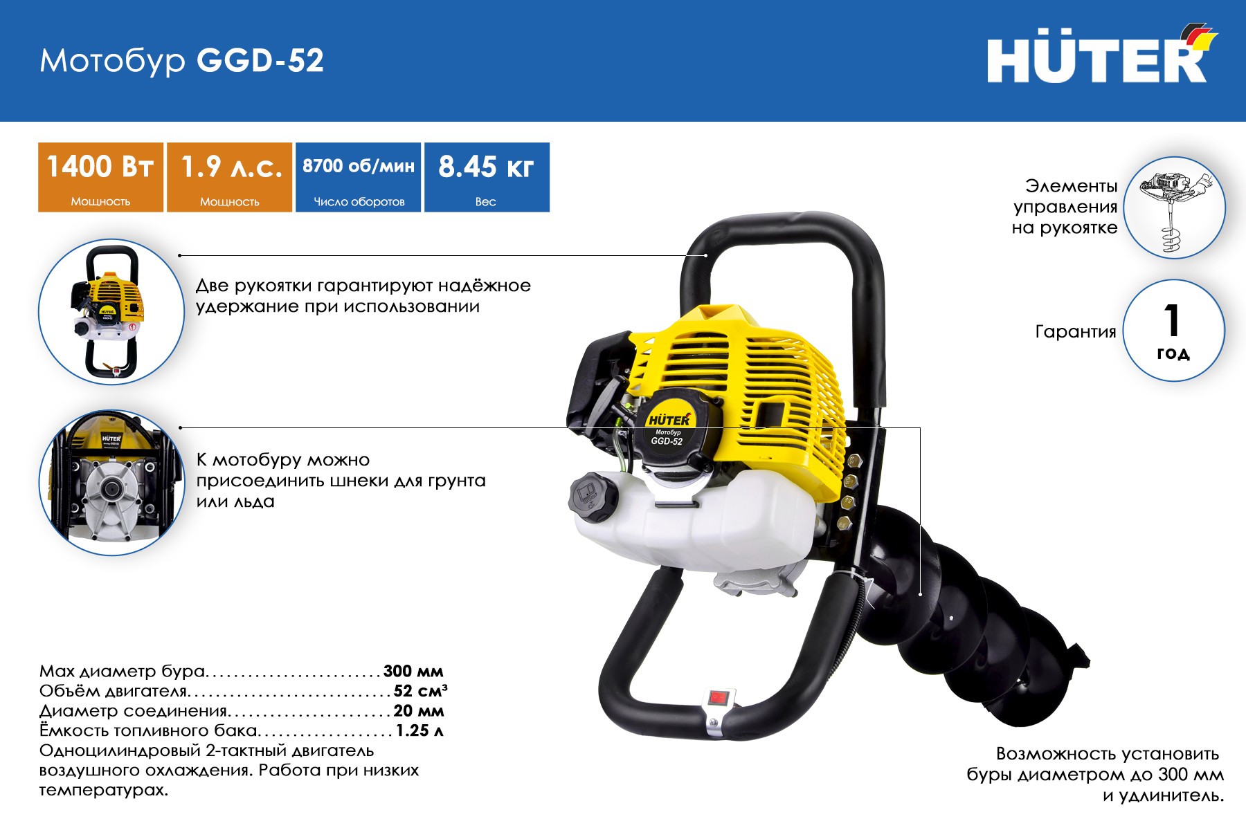 Мотобур Huter GGD-52 (70/13/1)