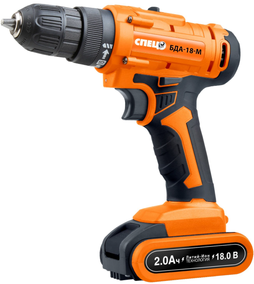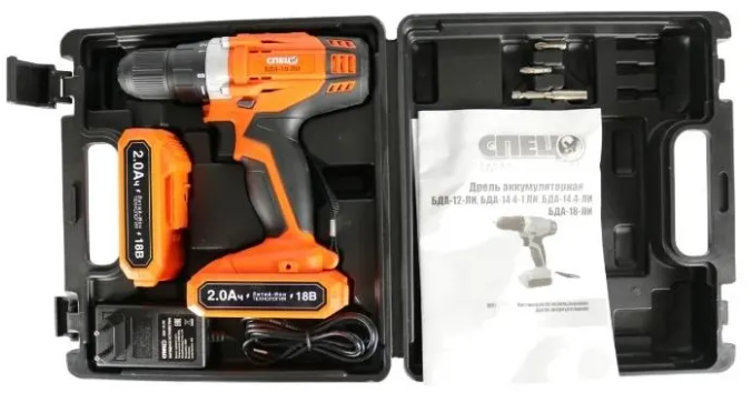 Дрель аккум.СПЕЦ БДА-18-М, 18В,2аккум *2,0Ач, Ли-Ион, 0-350/0-1350об/мин,42Нм,реверс,регулир.момента, подсветка, зарядка 1ч, кейс