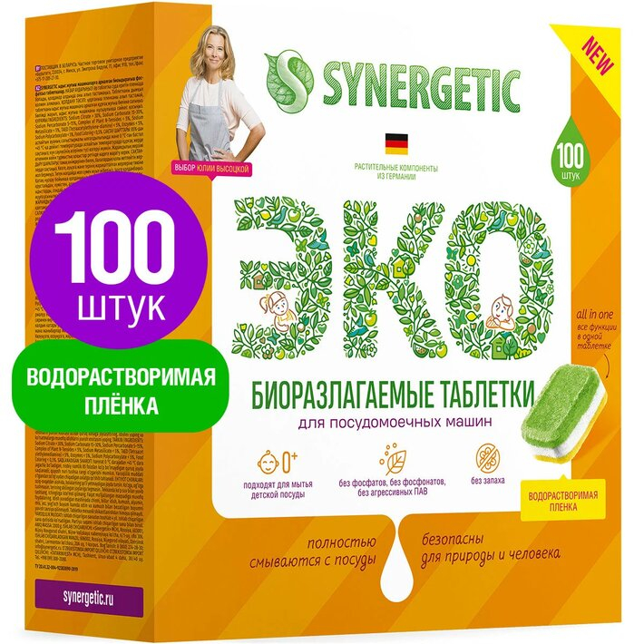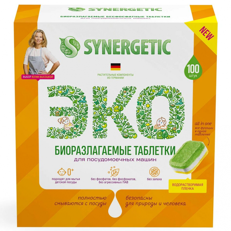 Таблетки для посудомоечных машин SYNERGETIC без отдушки (упак.:100шт) (102100)
