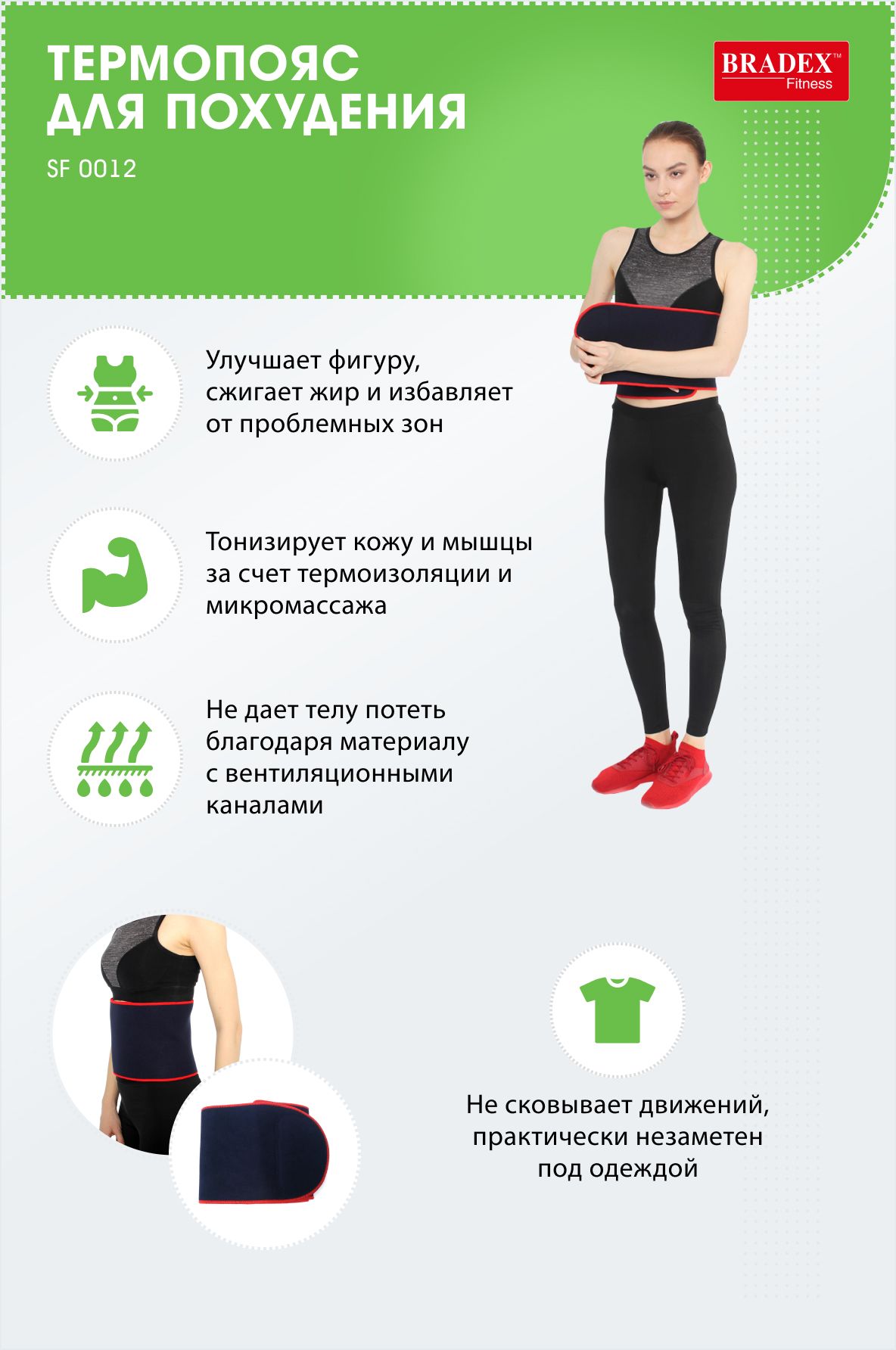 Термопояс Bradex SF 0012 поможет значительно улучшить фигуру и избавиться от проблемных зон. Хотя одного пояса будет недостаточно, необходимо добавить физическую нагрузку и низкокалорийную диету.