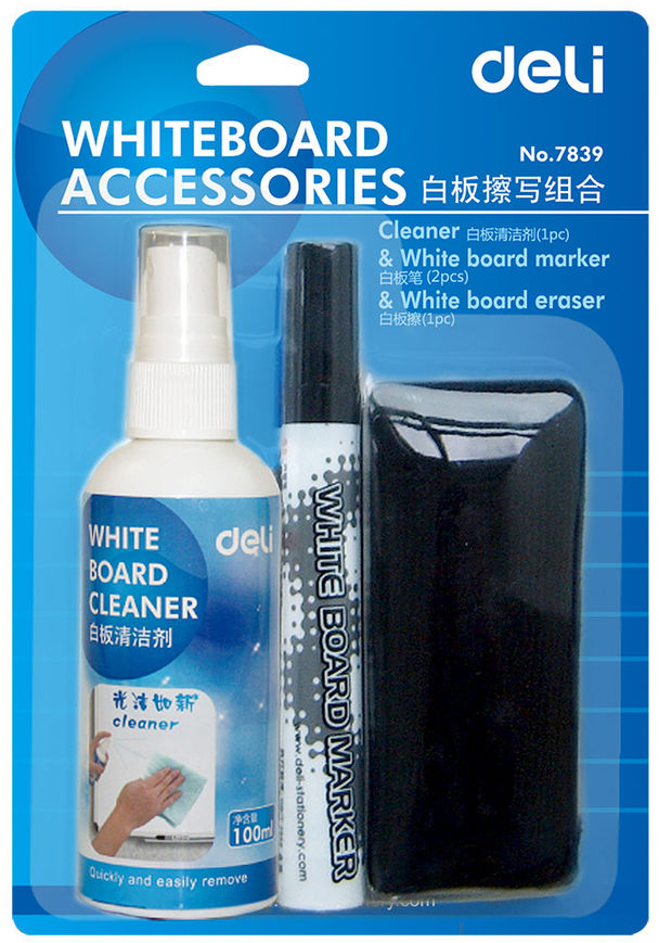 В наборе: спрей 100 мл для очистки доски, 2 маркера ( черный и синий), стиратель для доски.