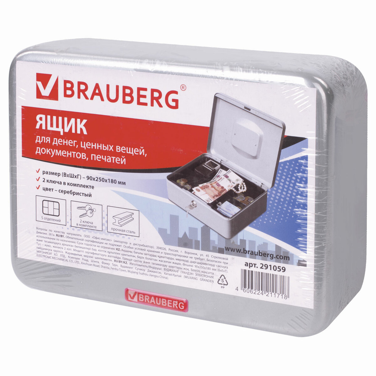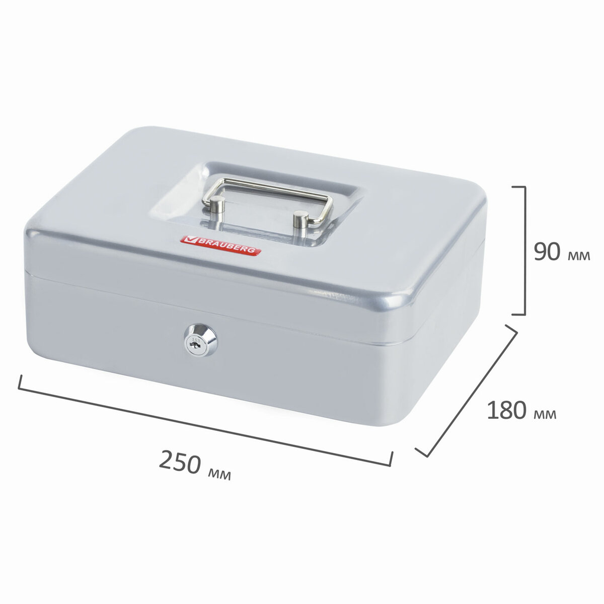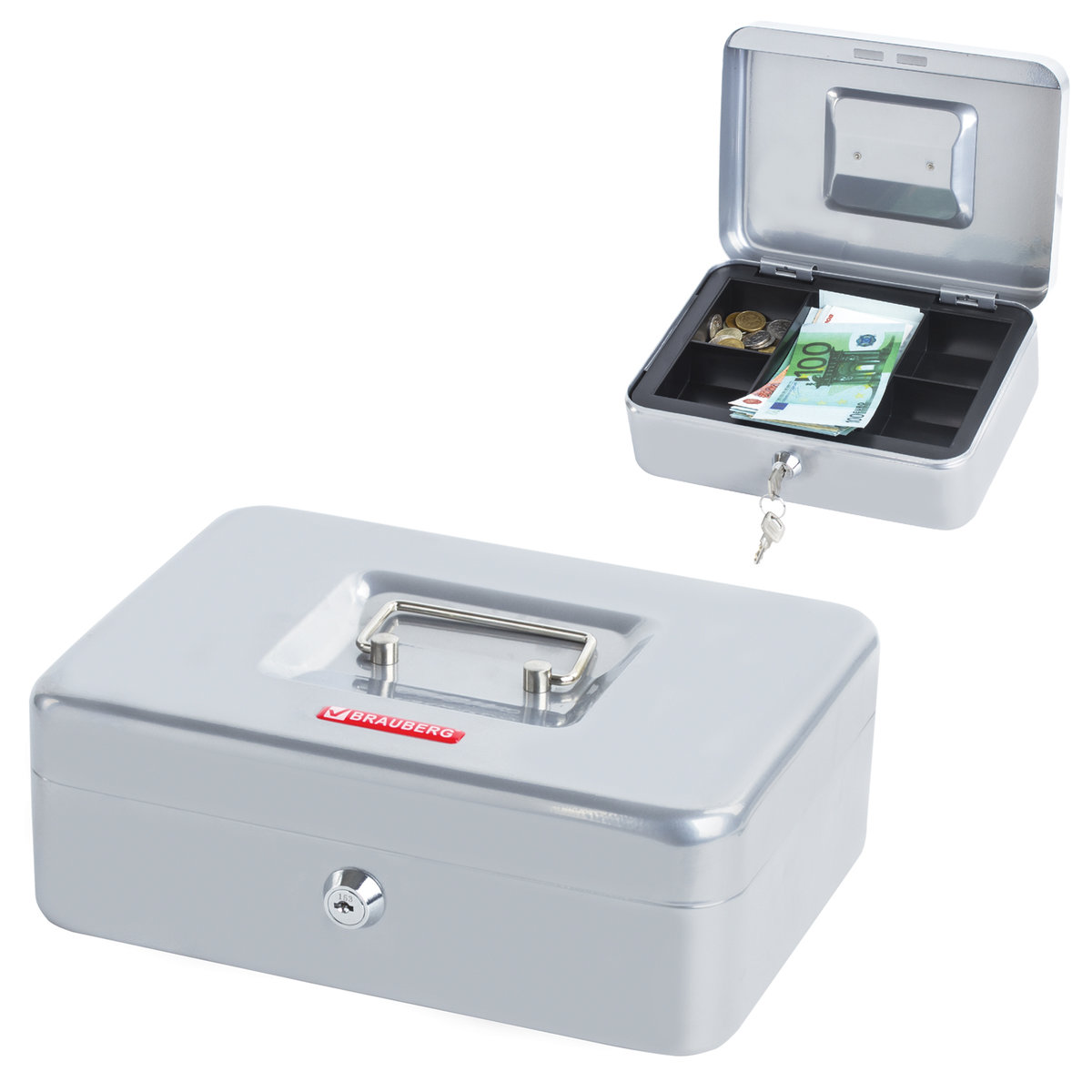 Ящик BRAUBERG предназначен для хранения и транспортировки денег, ценных вещей, документов, печатей, медикаментов. Используется дома и в офисе для ограничения доступа посторонних лиц. Отличное сочетание надёжности и вместительности. Съемный лоток из ударопрочного пластика с 3 отделениями. Подходит для денег, карточек, ключей, печатей. Под лотком есть пространство, где можно хранить документы и бумаги.