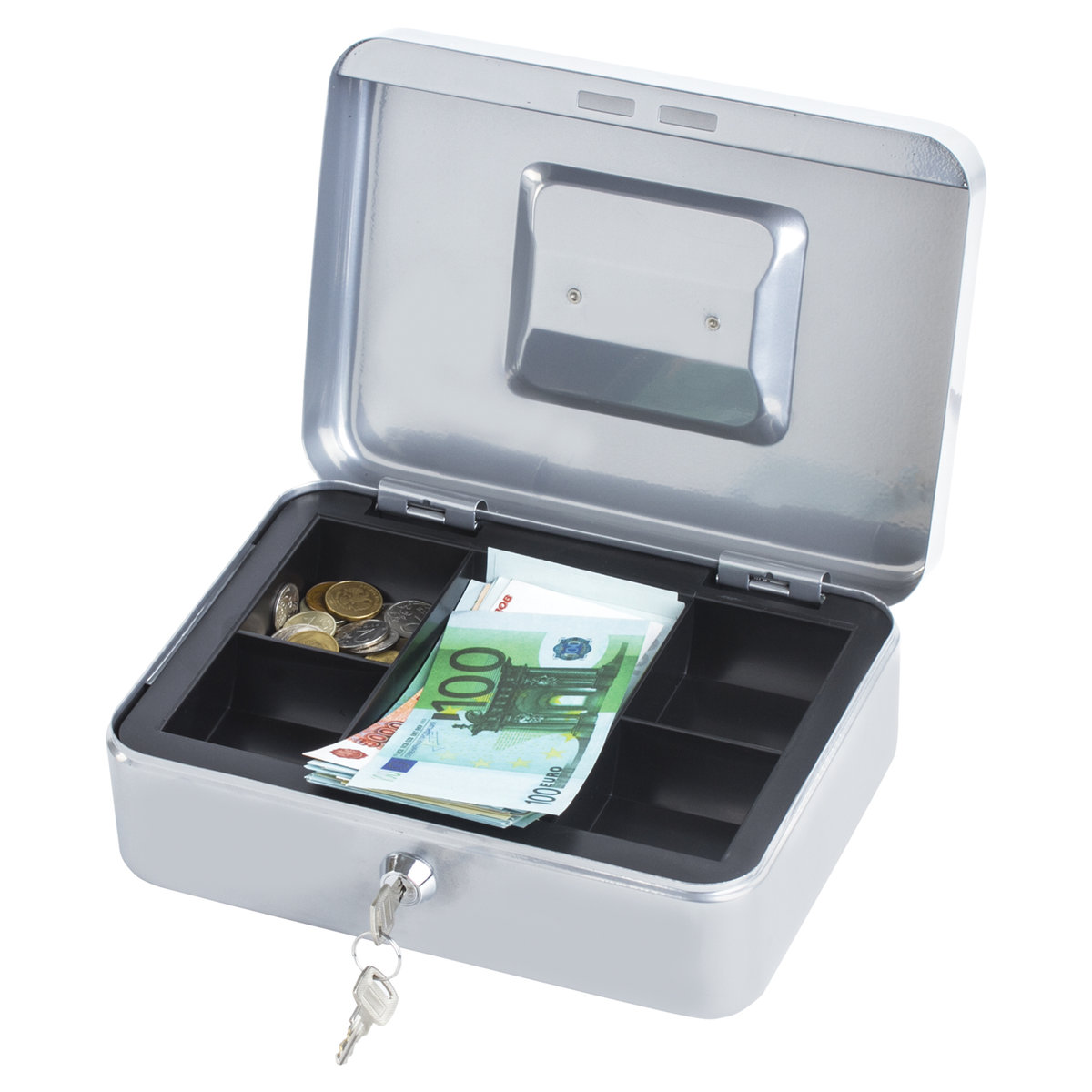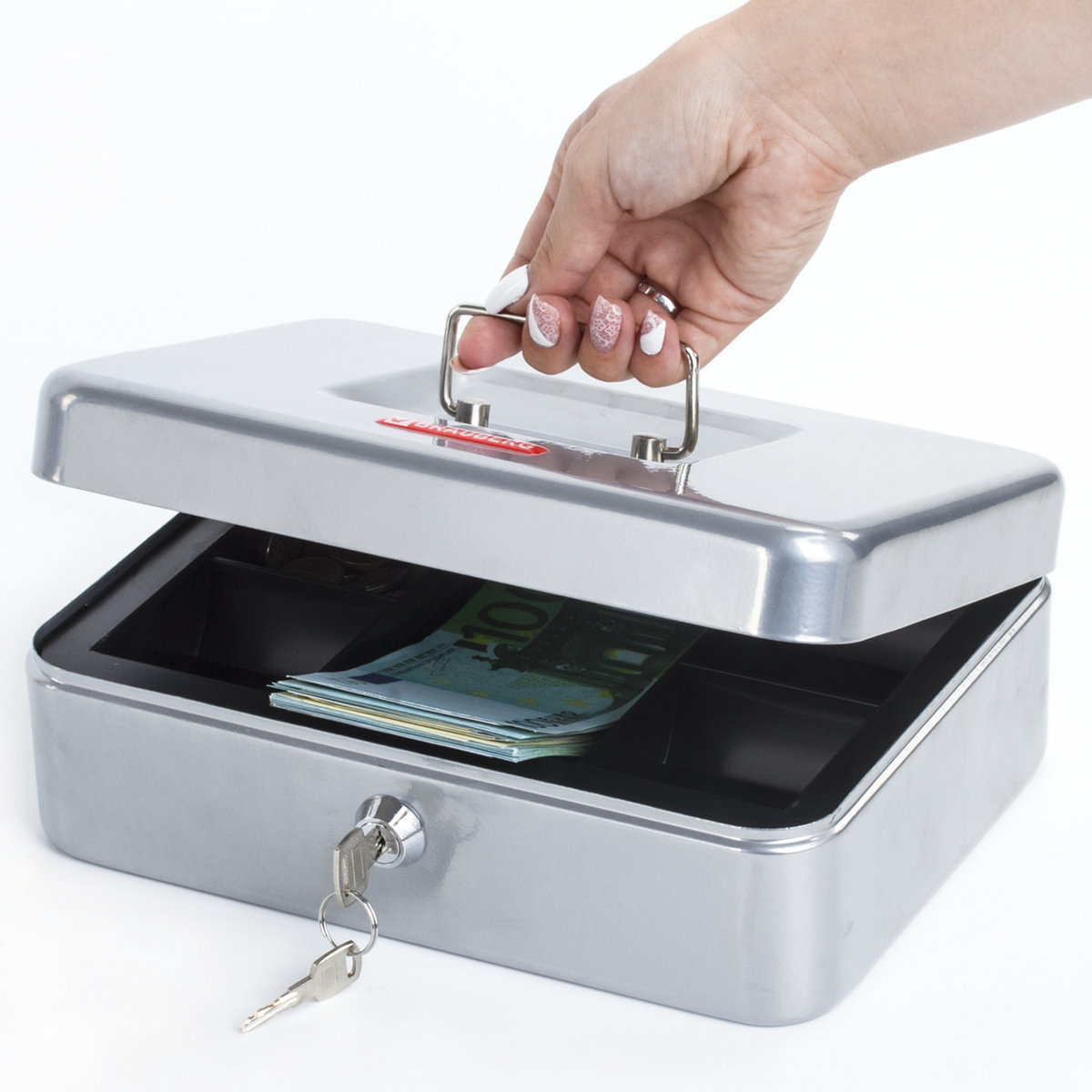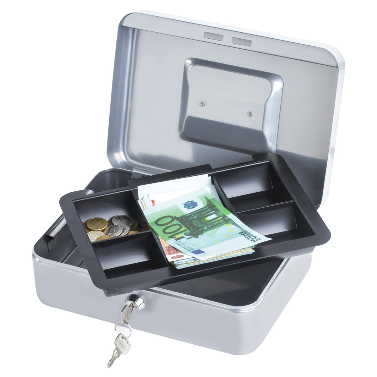 Ящик BRAUBERG предназначен для хранения и транспортировки денег, ценных вещей, документов, печатей, медикаментов. Используется дома и в офисе для ограничения доступа посторонних лиц. Отличное сочетание надёжности и вместительности. Съемный лоток из ударопрочного пластика с 3 отделениями. Подходит для денег, карточек, ключей, печатей. Под лотком есть пространство, где можно хранить документы и бумаги.