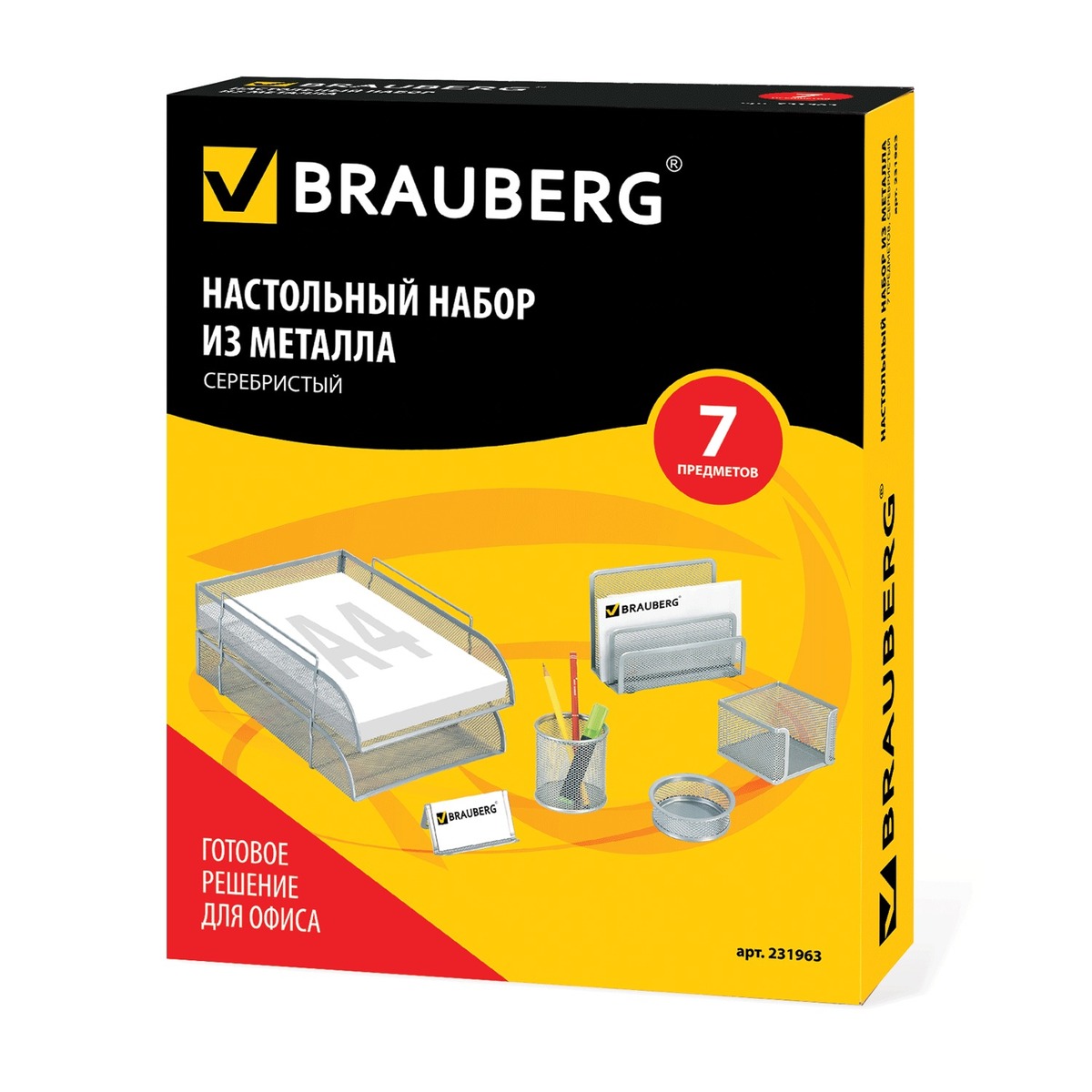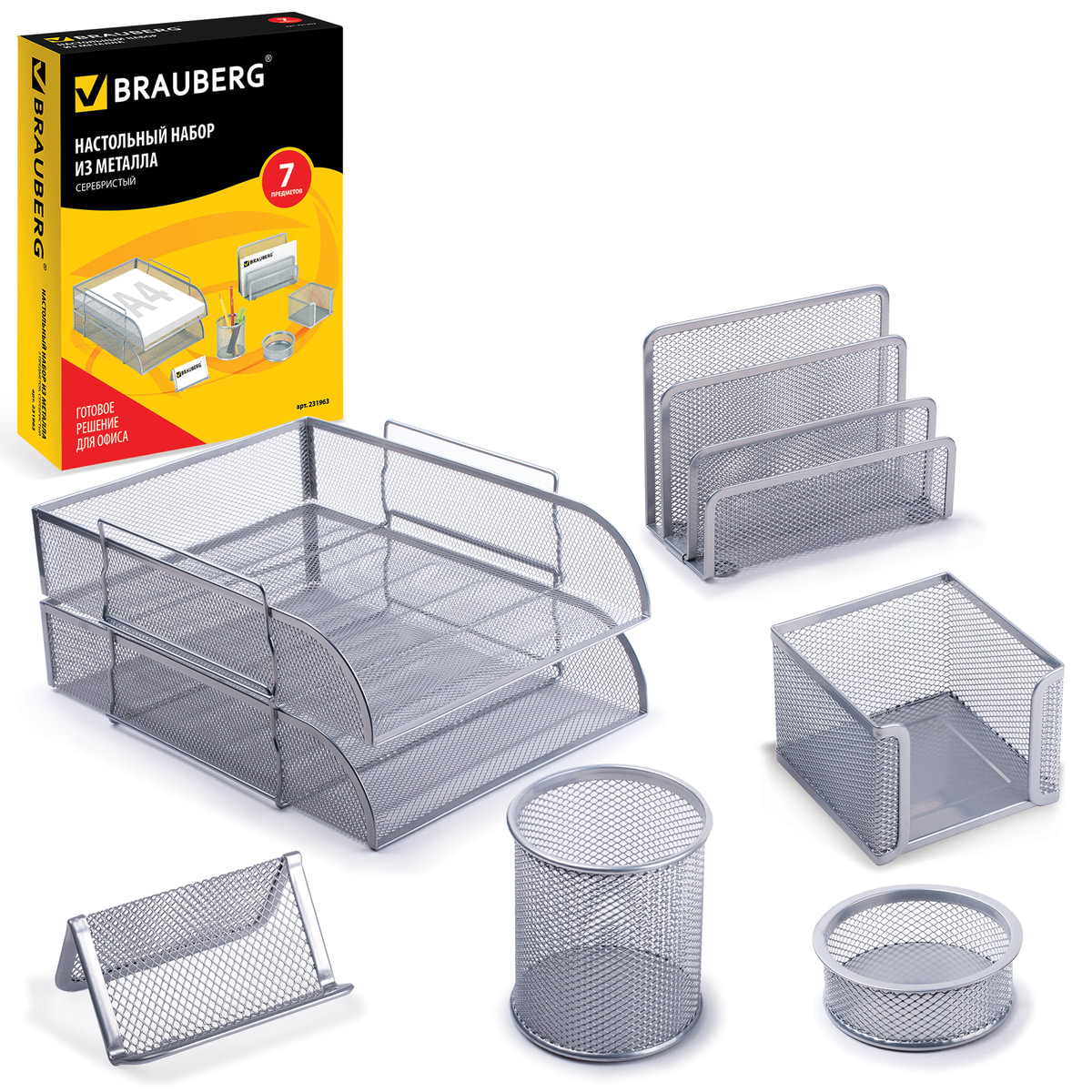 Настольный набор из металла BRAUBERG "Germanium" - это готовое решение для офиса. Позволяет содержать в порядке все письменные принадлежности и документы, а также эффективно их использовать. В комплект набора входят 7 предметов: