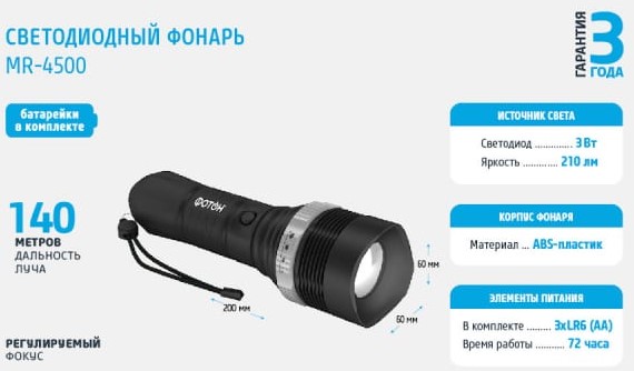 Обсуждение фонаря светодиодного Фотон MR-4500 black (черный): вопросы и ответы
