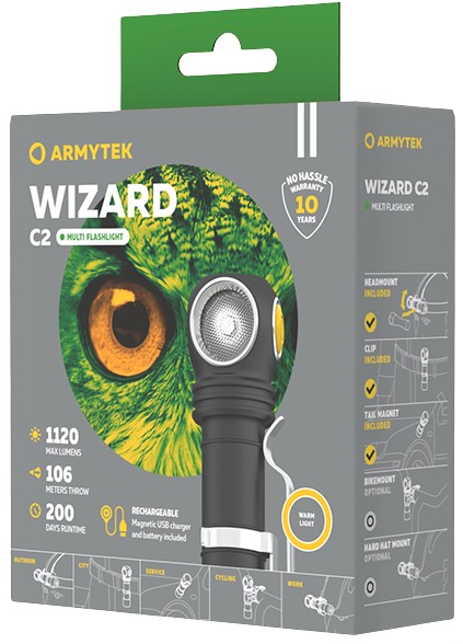 Яркость света данной модели достигает 1120 люмен на расстоянии до 106 метров. Аккумулятор 18650 Li-Ion емкостью 3200 мАч заряжается в фонаре с использованием специального магнитного USB-кабеля. Универсальным Wizard C2 делает возможность нескольких вариантов фиксации: на металлических поверхностях благодаря магниту в задней крышке, на одежде, ремне или сумке с помощью клипсы, на голове в паре с комфортным налобным креплением.