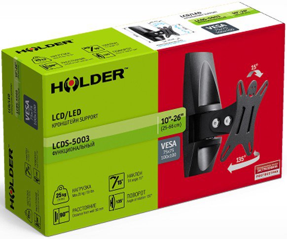 Кронштейн Holder LCDS-5003 – поворотно-наклонная модель, которая подходит для установки телевизора в помещениях со сложной планировкой. Он позволяет подвесить в нужном положении мультимедийное устройство, совместимое с креплением VESA, и выбрать оптимальный угол обзора его экрана. Применение прочного сплава в изготовлении кронштейна позволяет ему выдерживать большие нагрузки без повреждений и деформации.
