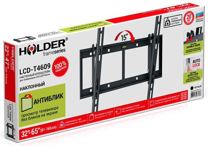 Кронштейн Holder LCD-T4609 – наклонная модель, которая позволяет зафиксировать телевизор на стене и выбрать оптимальный угол обзора его экрана. Применение стандартных креплений VESA и пузырькового уровня значительно облегчает позиционирование и монтаж мультимедийного устройства. В производстве кронштейна используется высокопрочный сплав, за счет чего он может выдерживать большие нагрузки без повреждения и деформации.
