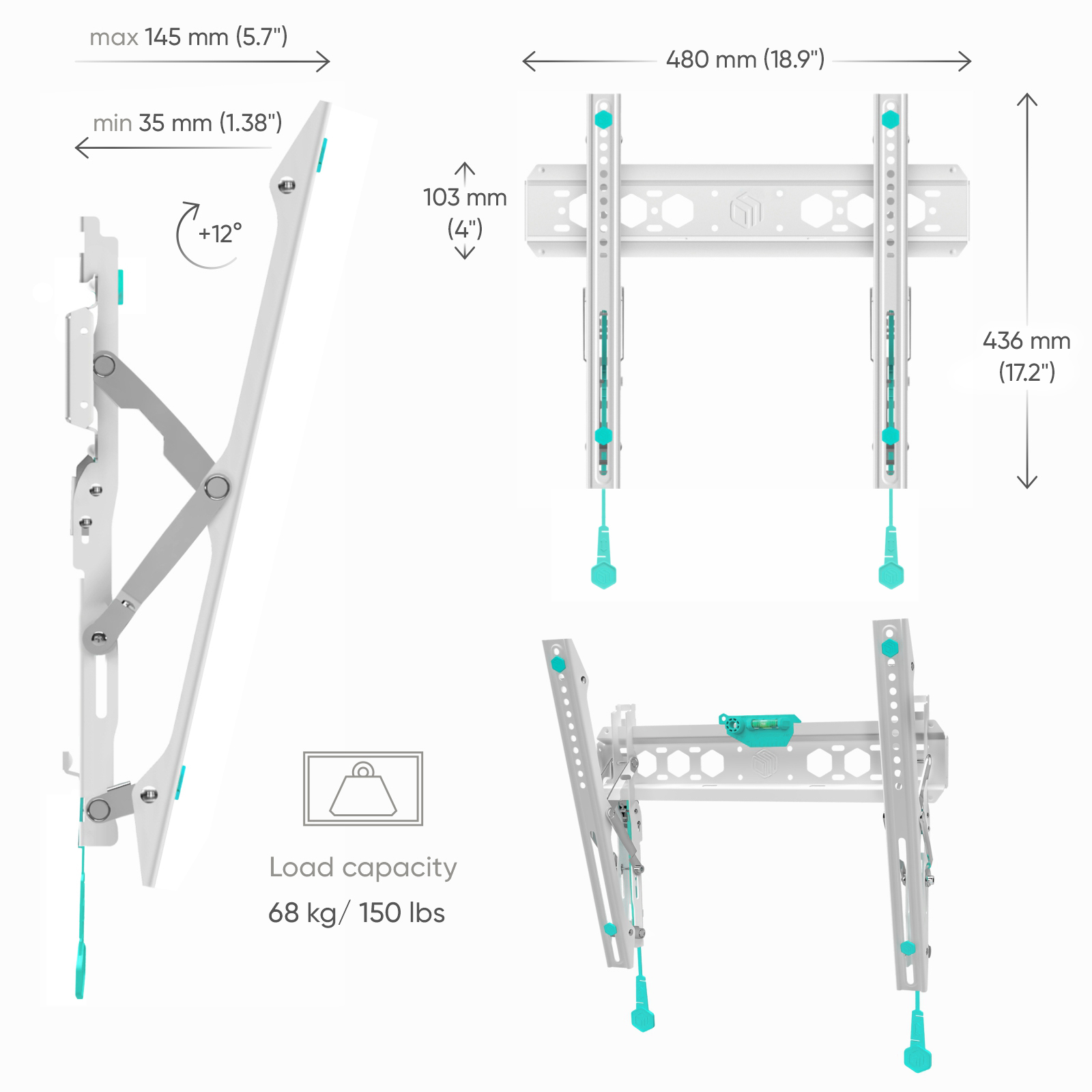 Настенный наклонный кронштейн ONKRON TM5 White предназначен для телевизоров с диагональю от 32 до 65 дюймов (81,28-165,1 см). Он отлично подходит для современных ТВ с широкой диагональю и небольшим весом. Кронштейн выдерживает до 68 кг. Крепление универсально за счет множества предусмотренных производителем размеров VESA – от 75x75 мм до 400x400 мм.
